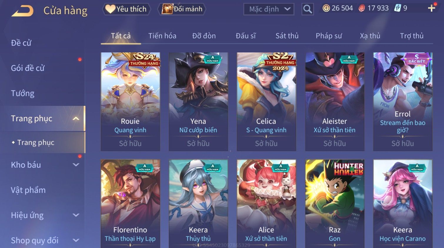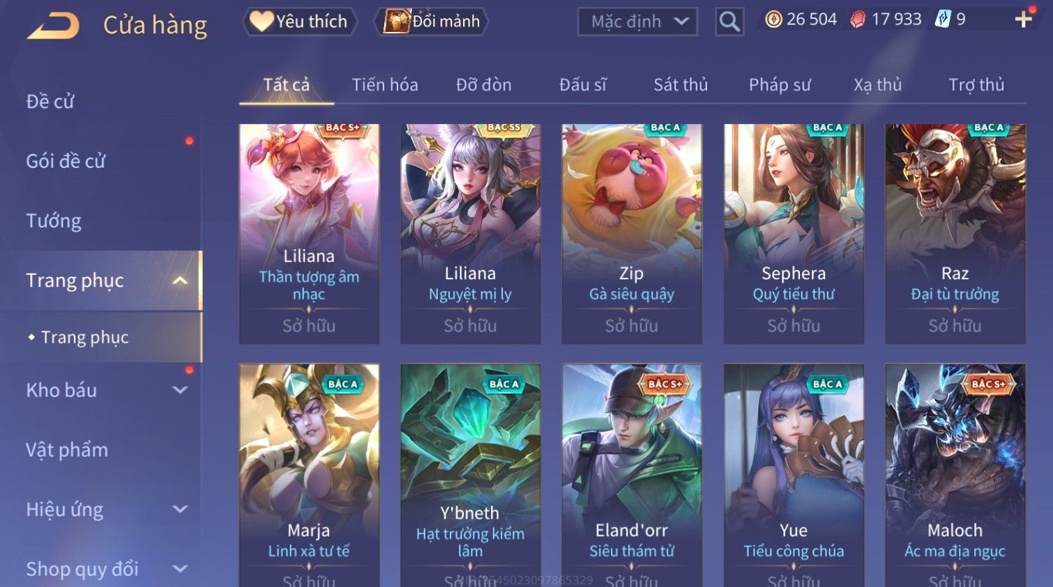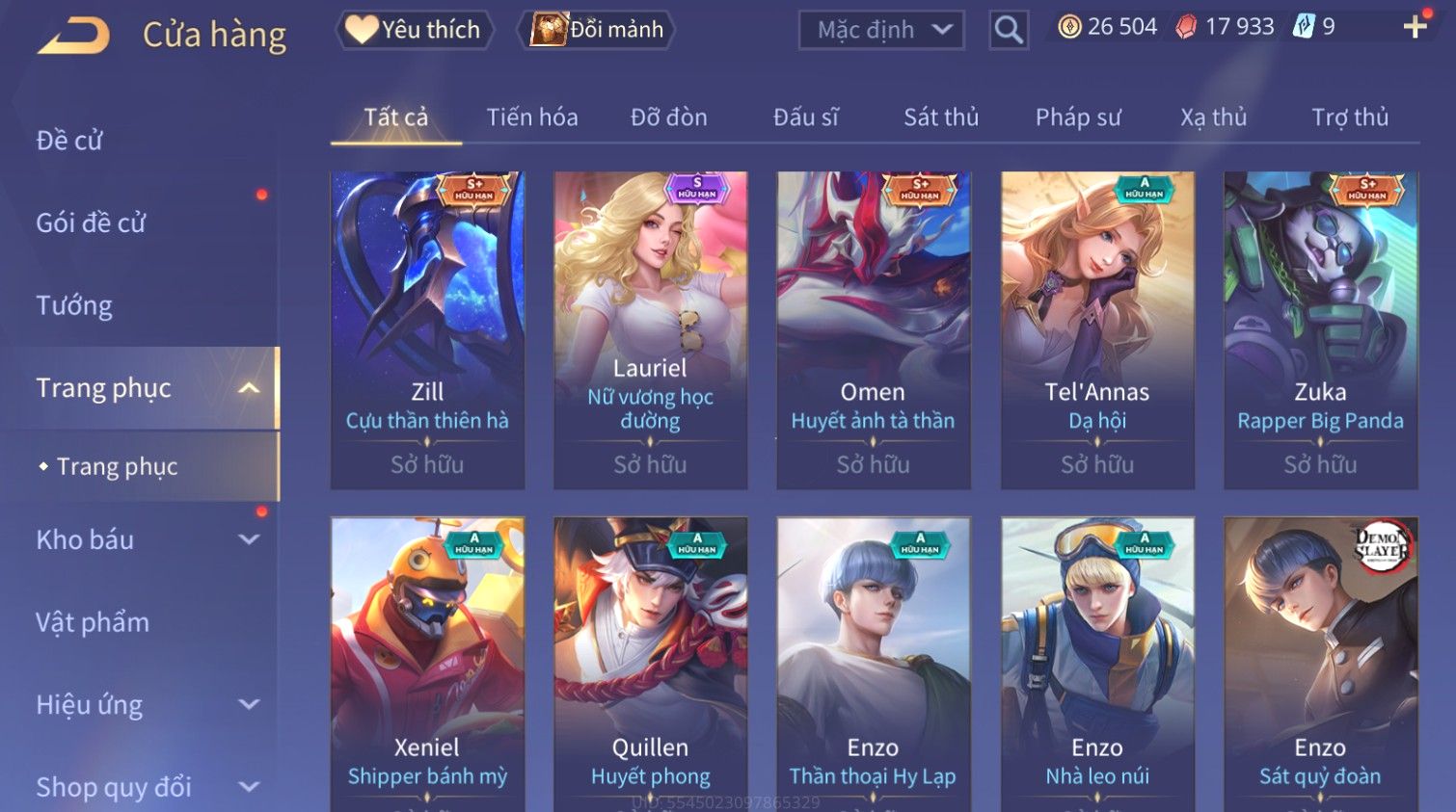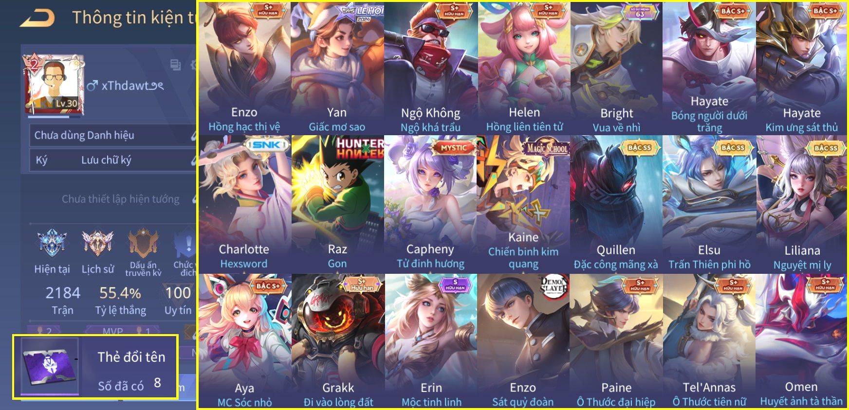 Nổi bật: Skin: Raz Gon×Capheny Tử Đinh Hương×Quillen Đặc Công Mãng Xà×Elsu Trấn Thiên Phi Hồ×Liliana Nguyệt Mị Ly×Aya Mc Sóc Nhỏ×Grakk Đi Vào Lòng Đất×Charlotte