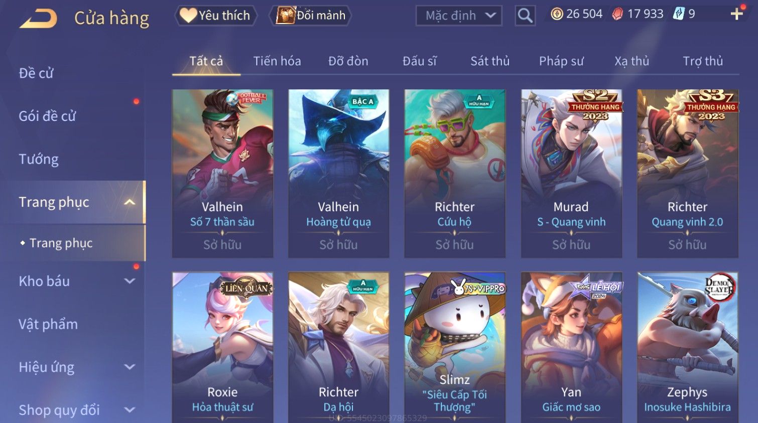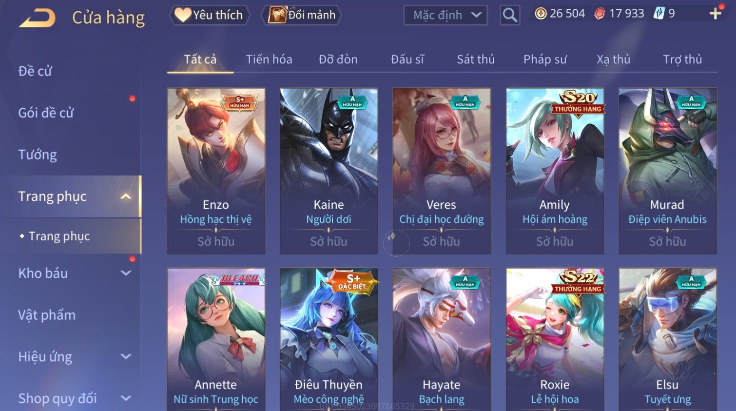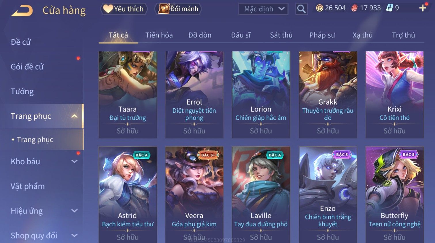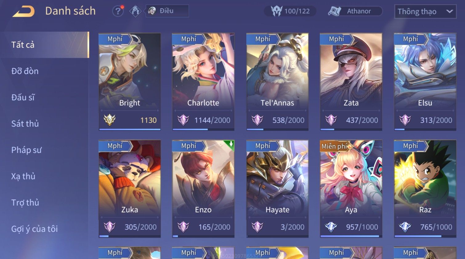 Nổi bật: Skin: Raz Gon×Capheny Tử Đinh Hương×Quillen Đặc Công Mãng Xà×Elsu Trấn Thiên Phi Hồ×Liliana Nguyệt Mị Ly×Aya Mc Sóc Nhỏ×Grakk Đi Vào Lòng Đất×Charlotte