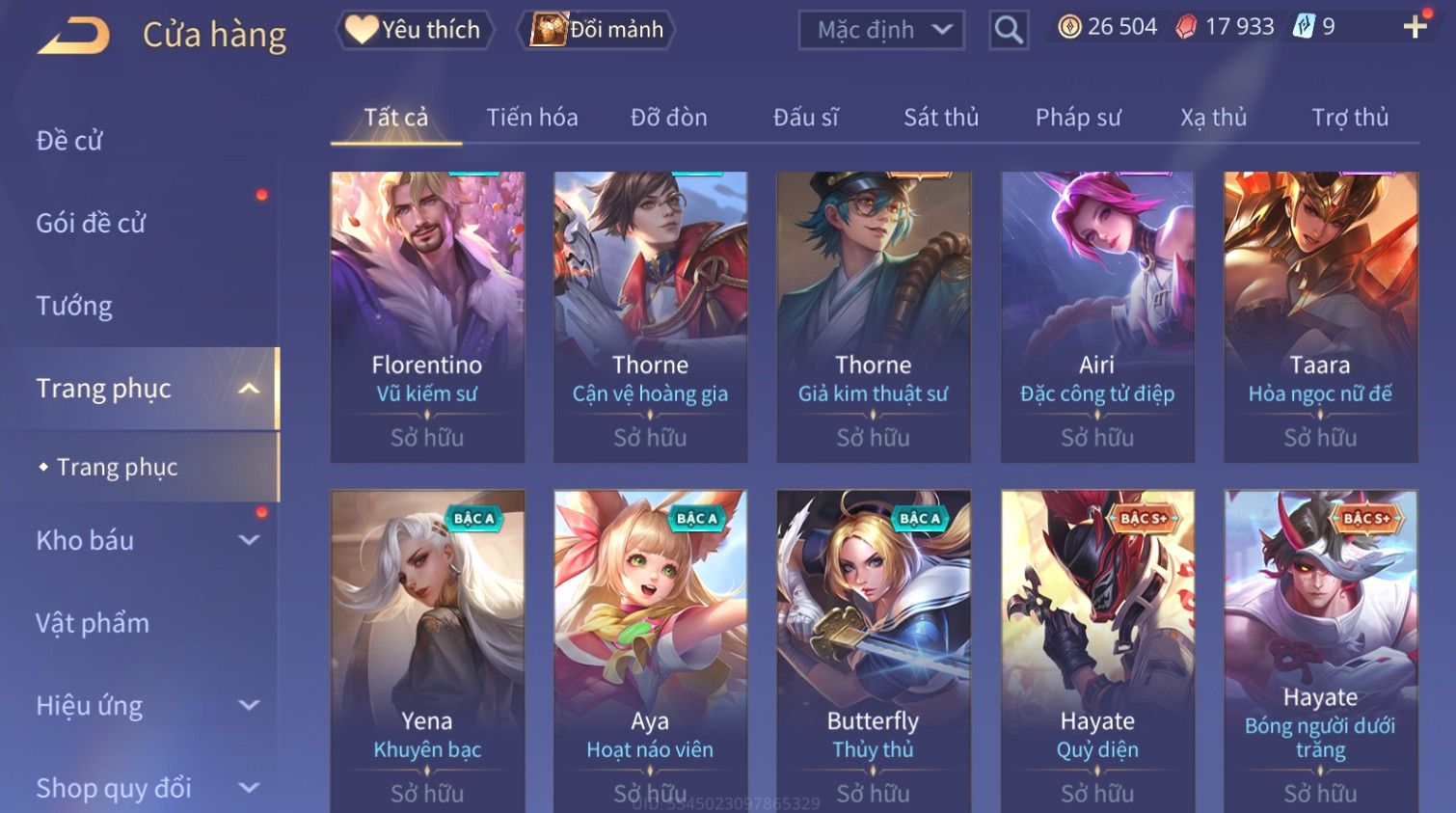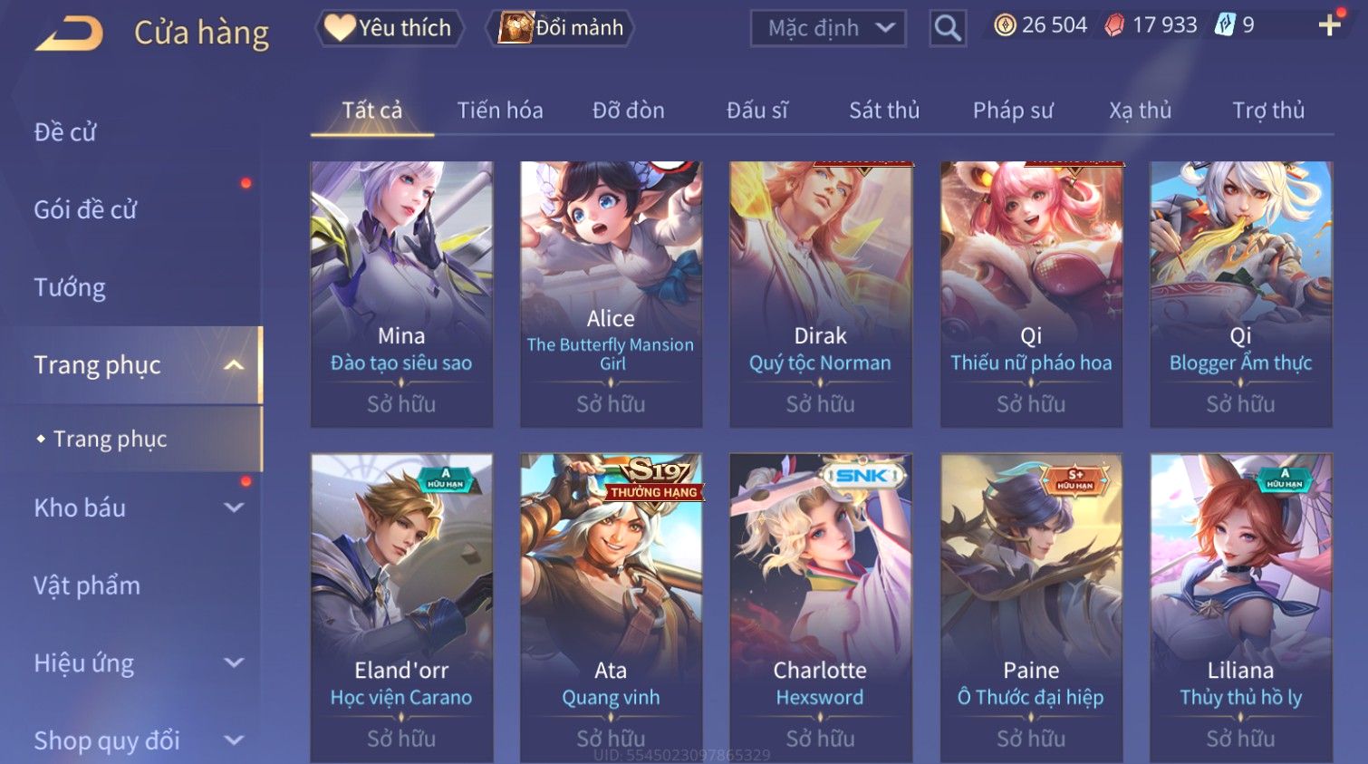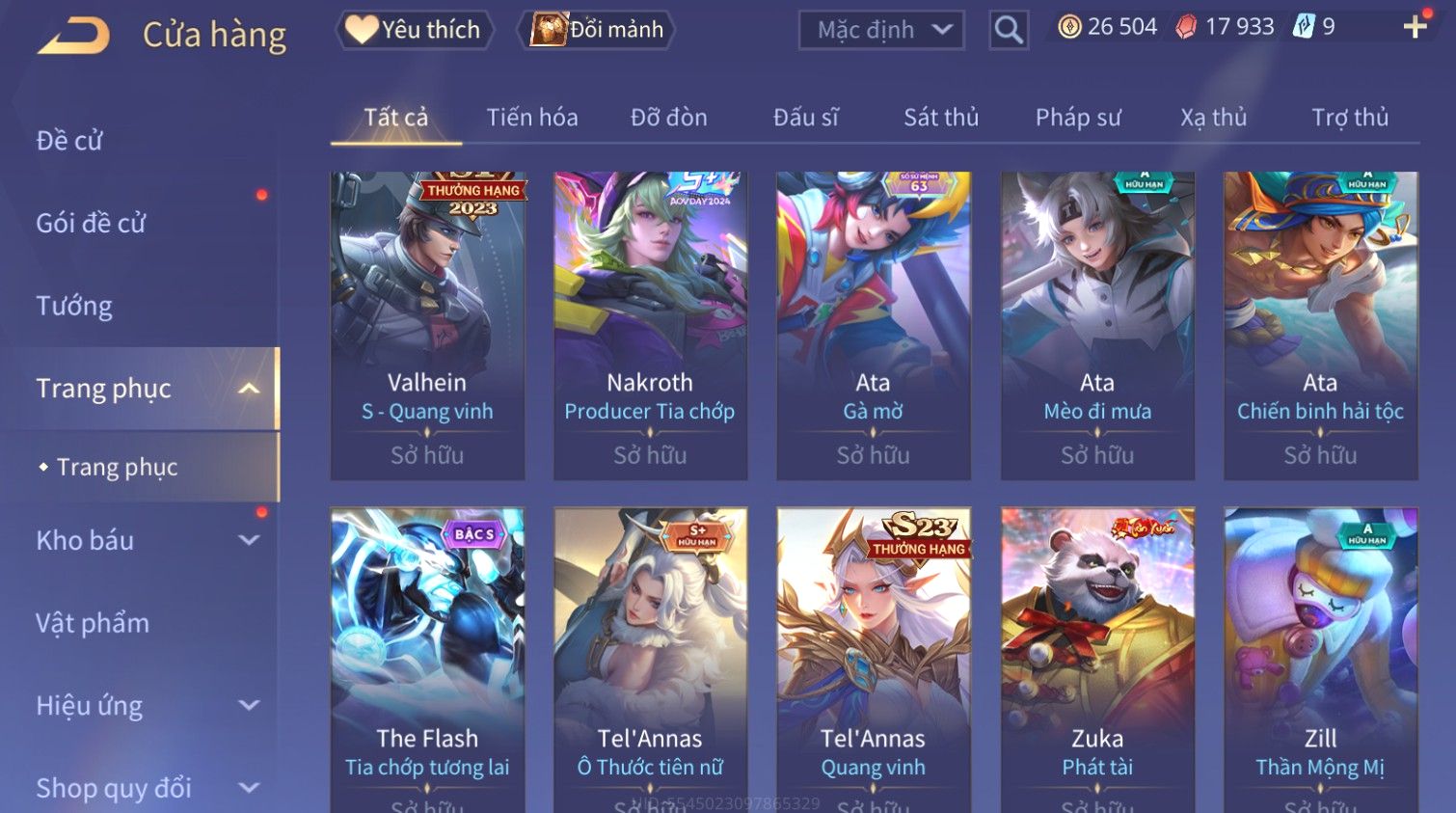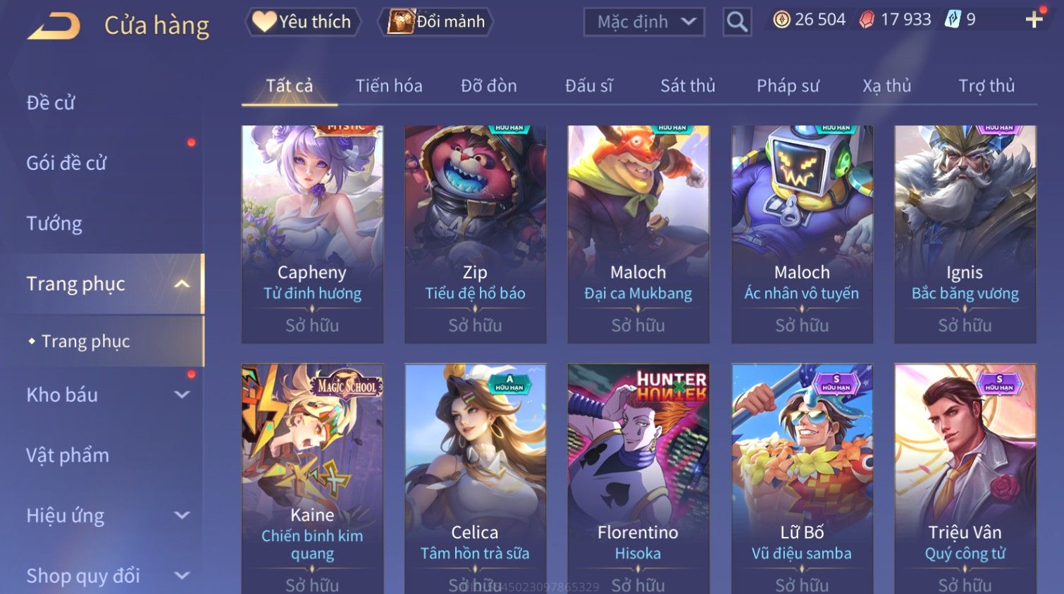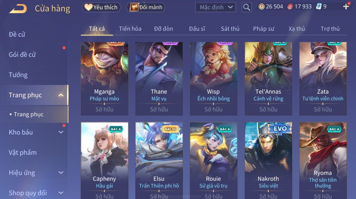 Nổi bật: Skin: Raz Gon×Capheny Tử Đinh Hương×Quillen Đặc Công Mãng Xà×Elsu Trấn Thiên Phi Hồ×Liliana Nguyệt Mị Ly×Aya Mc Sóc Nhỏ×Grakk Đi Vào Lòng Đất×Charlotte