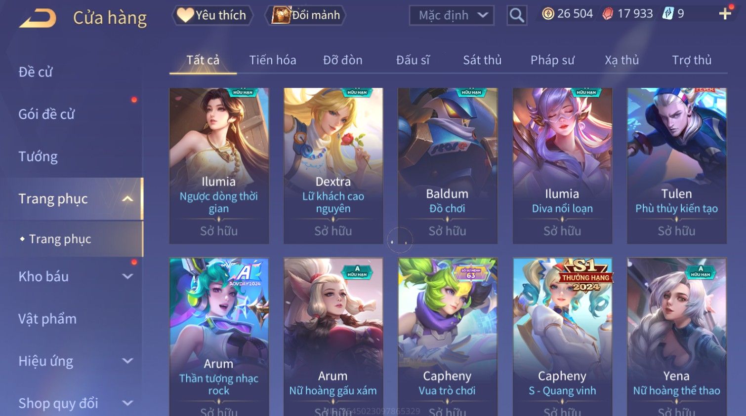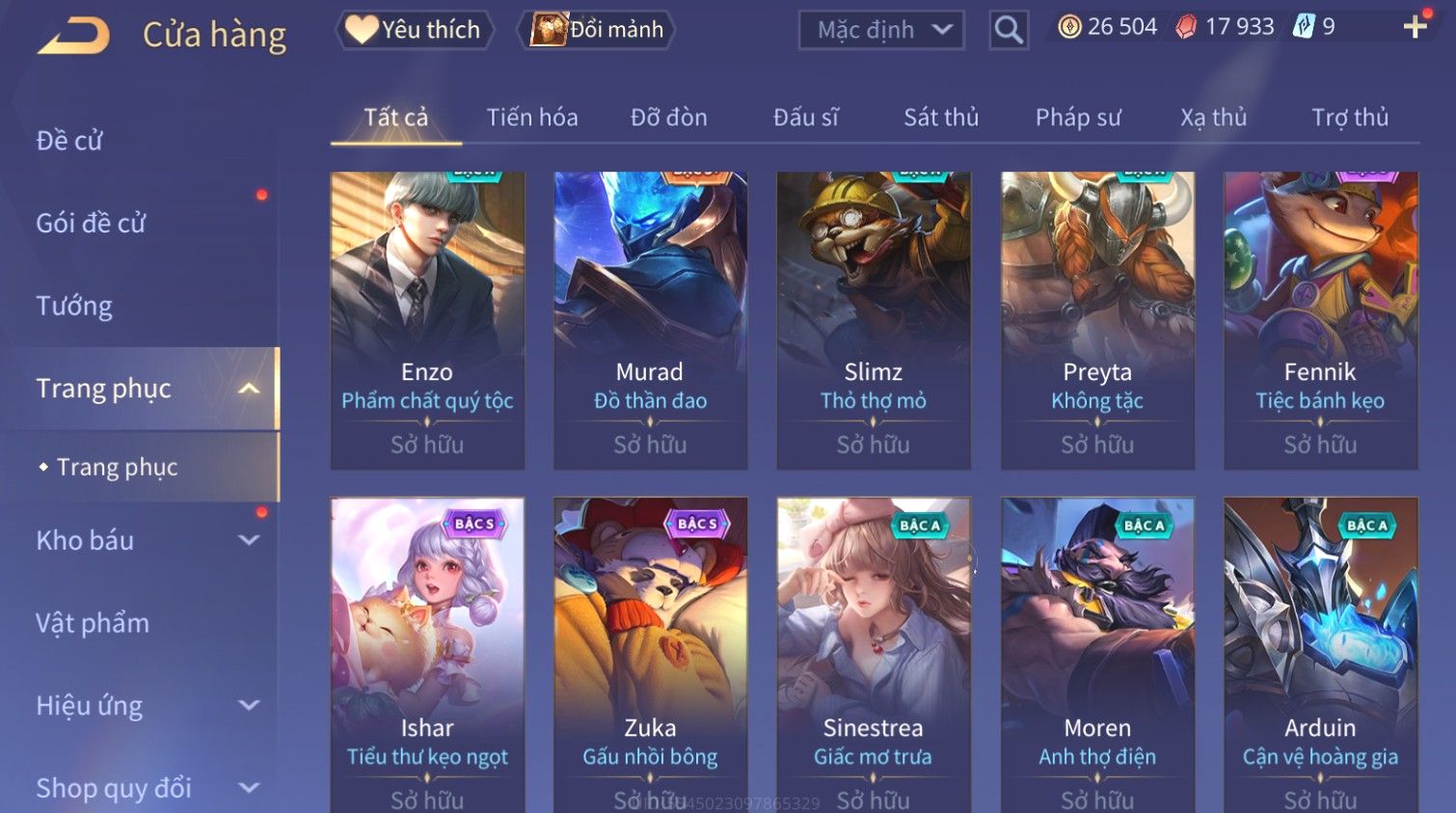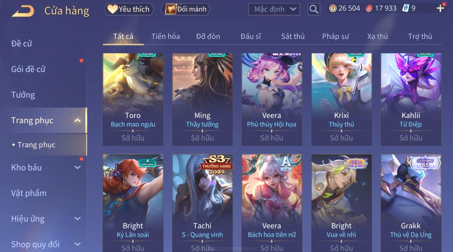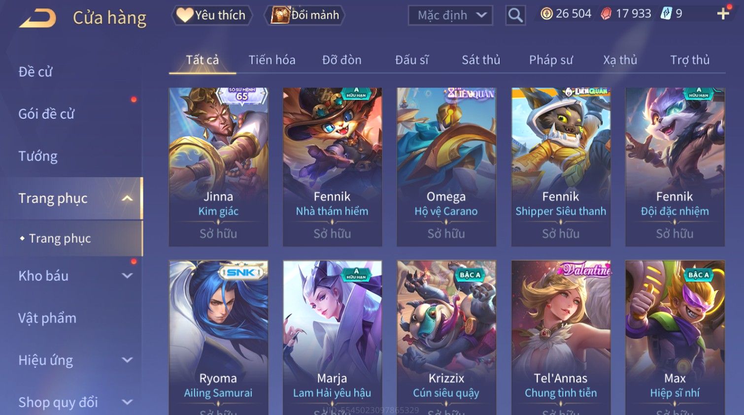 Nổi bật: Skin: Raz Gon×Capheny Tử Đinh Hương×Quillen Đặc Công Mãng Xà×Elsu Trấn Thiên Phi Hồ×Liliana Nguyệt Mị Ly×Aya Mc Sóc Nhỏ×Grakk Đi Vào Lòng Đất×Charlotte
