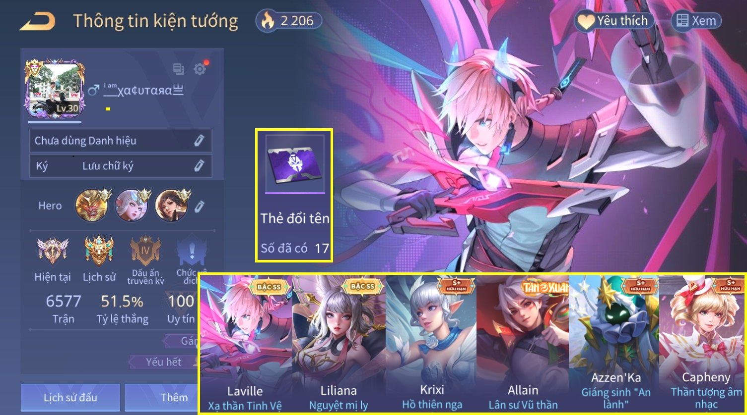 Nổi bật: Skin: Laville Xạ thần Tinh Vệ×Liliana Nguyệt Mị Ly×Krixi Hồ Thiên Nga×Capheny Thần Tượng Âm Nhạc×Full Ngọc, Nhiều Skin Đẹp