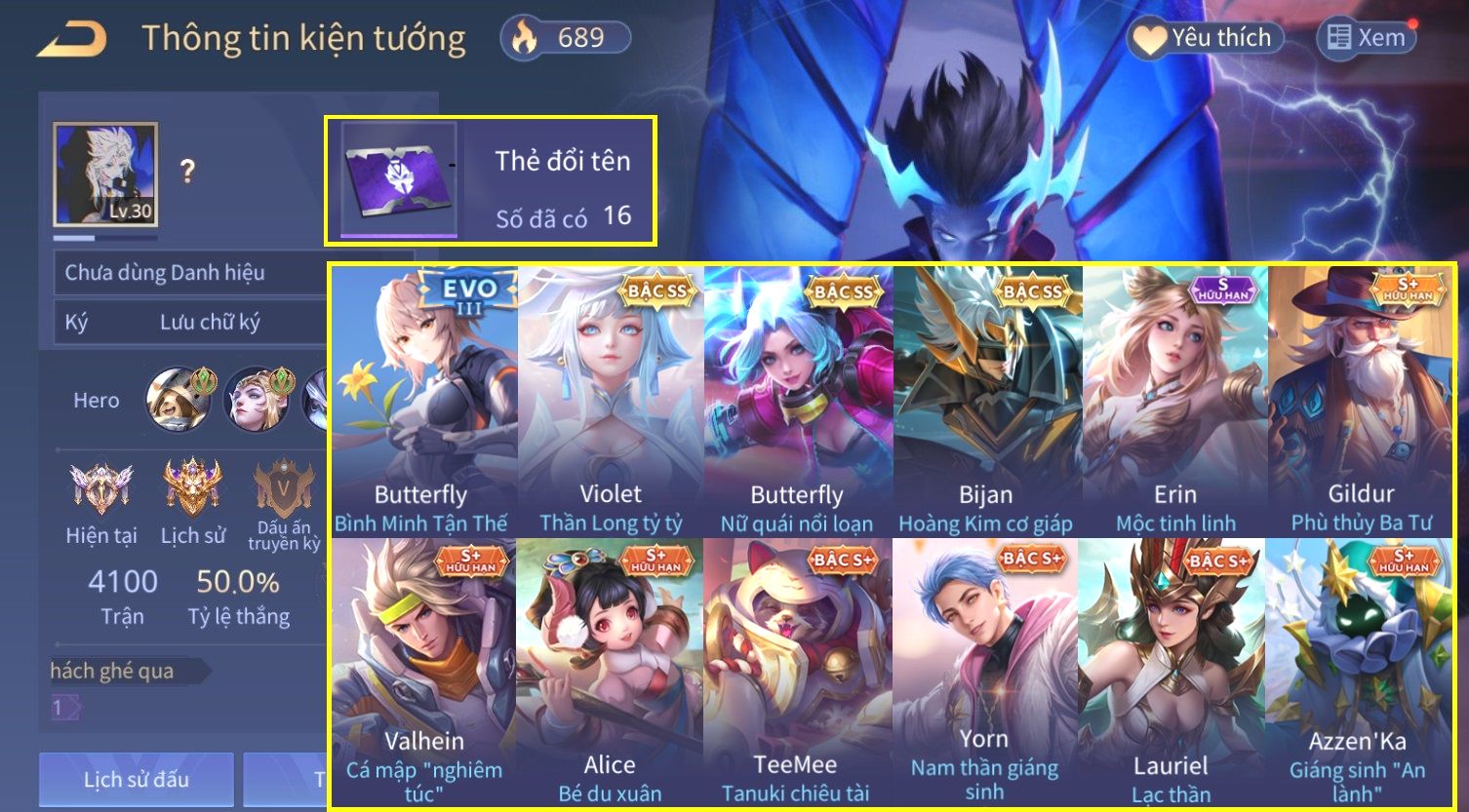 Nổi bật: Skin: Violet Thần Long Tỷ Tỷ×Bijan Hoàng Kim Cơ Giáp×Butterfly Nữ Quái Nổi Loạn×Gildur Phù Thủy Ba Tư×Valhein Cá Mập "Nghiêm Túc"×Full Ngọc, Nhiều Skin SS Đẹp