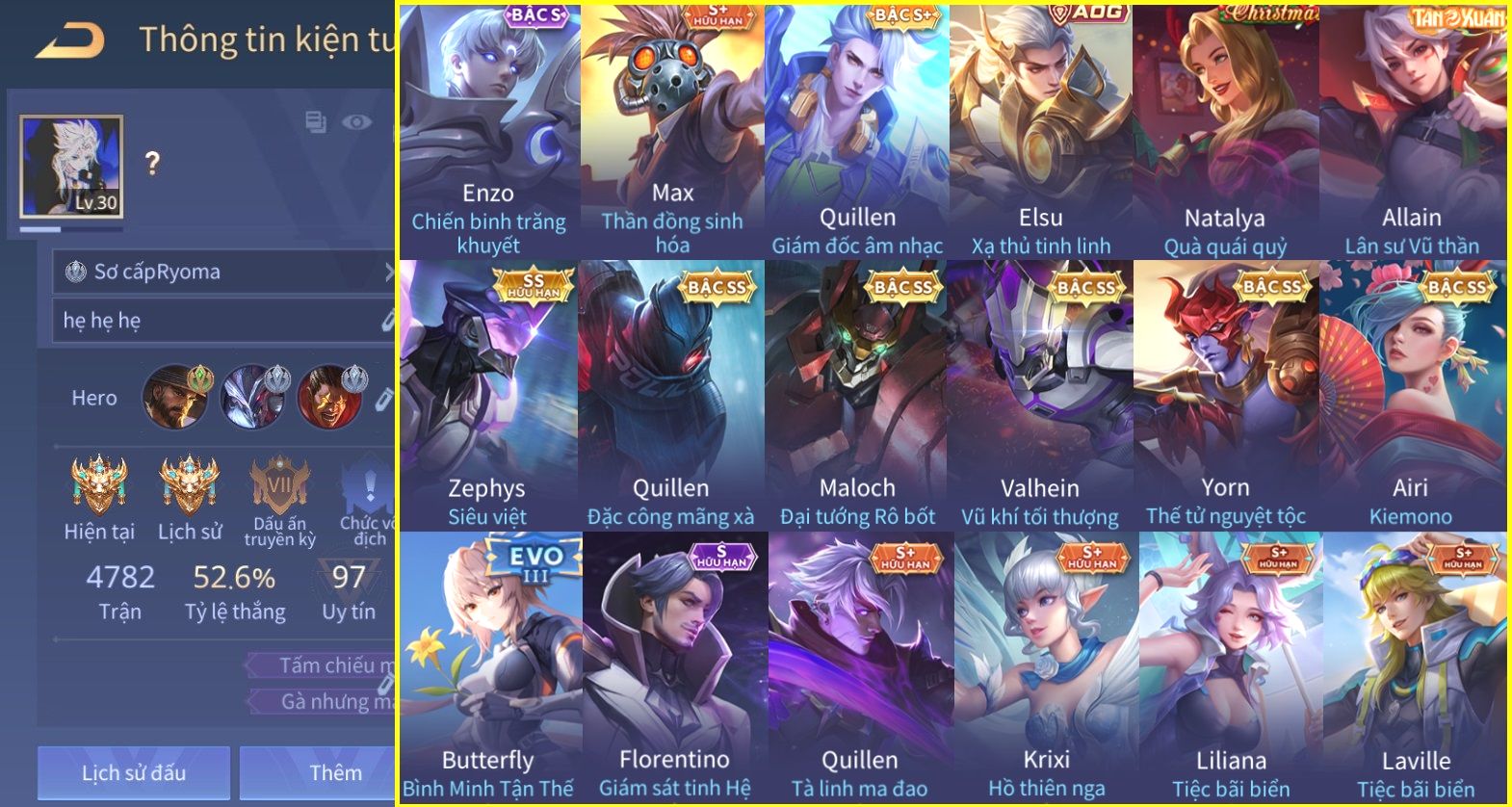 Nổi bật: Skin: Zephys Siêu Việt×Maloch Đại Tướng Rô Bốt×Quillen Đặc Công Mãng Xà×Florentino Giám Sát Tinh Hệ×Full Ngọc, Nhiều Skin SS Đẹp