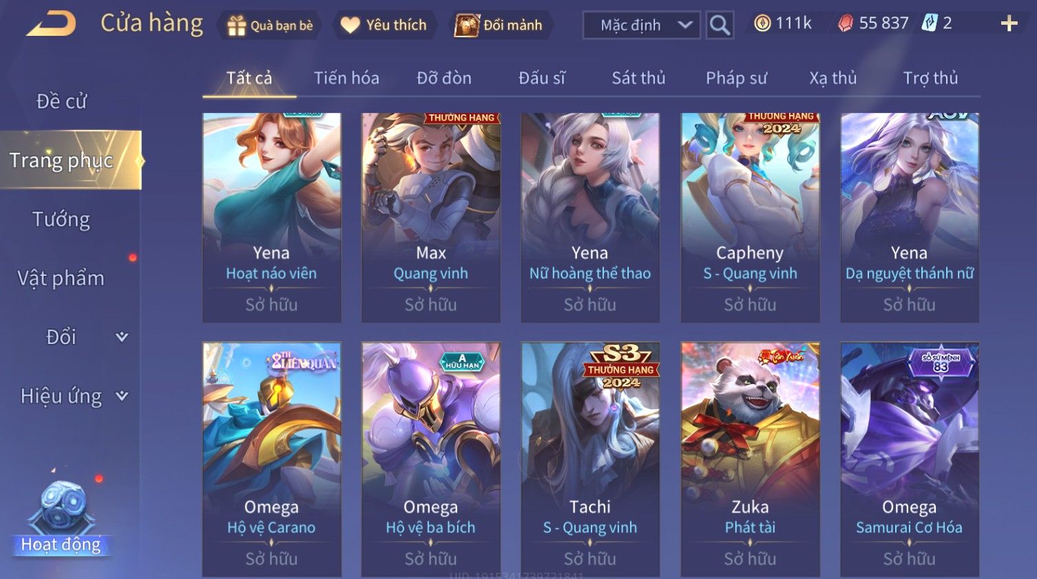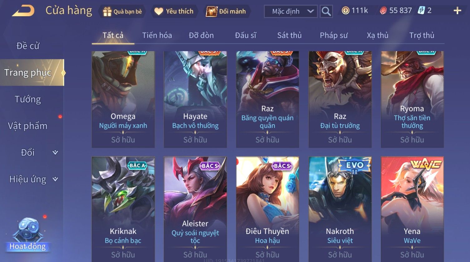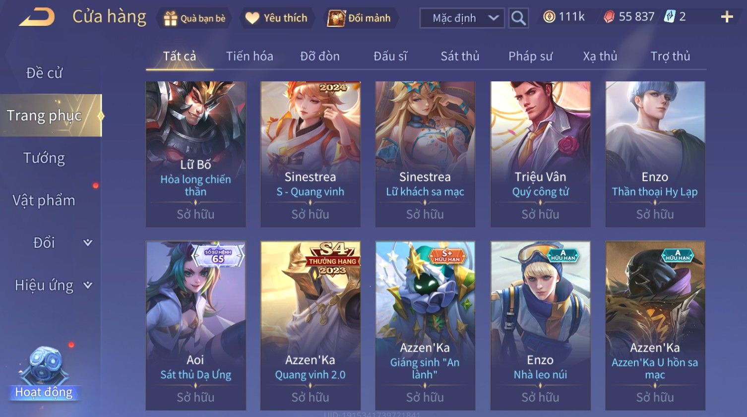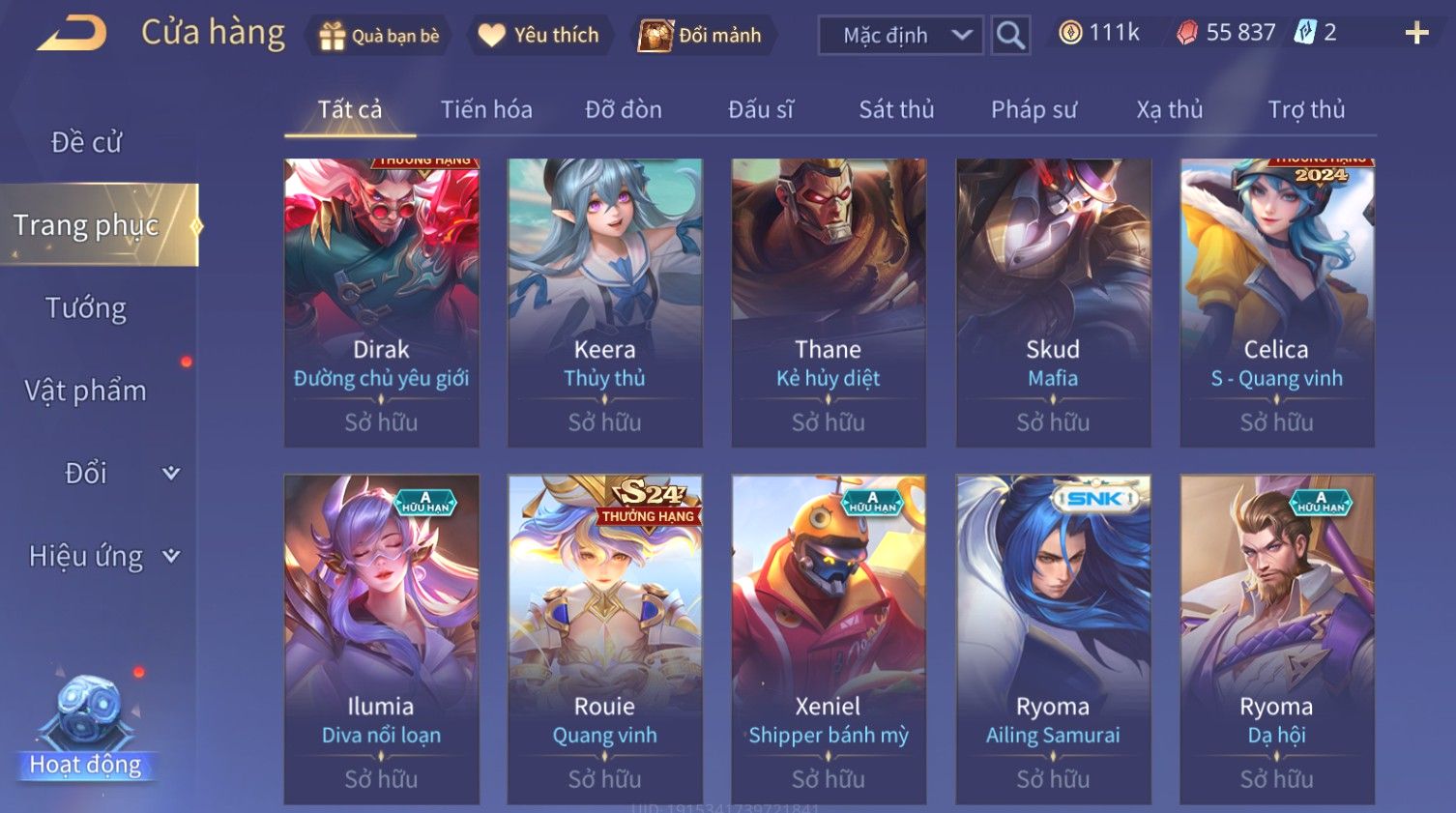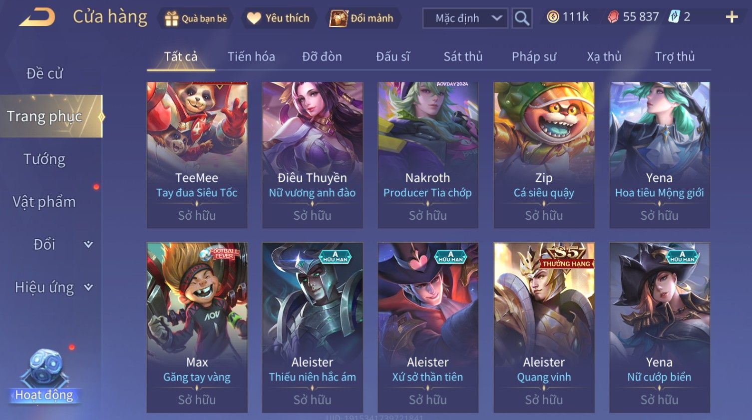 Nổi bật: Skin: Bijan Hoàng Kim Cơ Giáp×Laville Xạ thần Tinh Vệ×Violet Thần Long Tỷ Tỷ×Yena WaVe×Florentino Giám Sát Tinh Hệ×Hayate Chiến Binh Trăng Khuyết×Full Ngọc, Nhiều Skin SS Đẹp