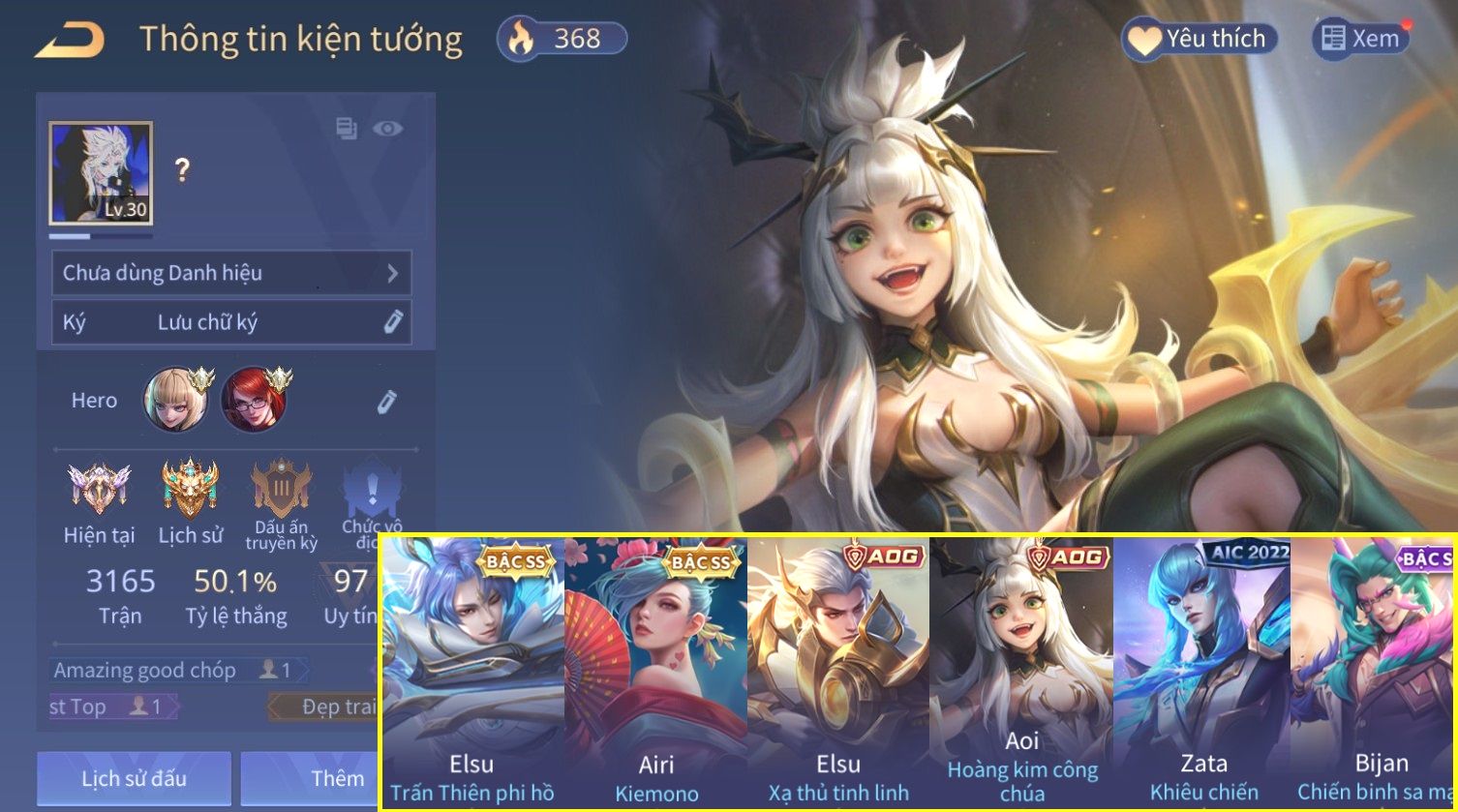 Nổi bật: Skin: Elsu Trấn Thiên Phi Hồ×Airi Kiemono×Aoi Hoàng Kim Công Chúa×Zata Khiêu Chiến×