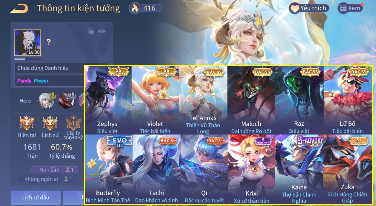 Nổi bật: Skin: Zephys Siêu Việt×Violet Tiệc Bãi Biển×Tel'Annas Thiên Vũ Thần Long×Maloch Đại Tướng Rô Bốt×Raz Siêu Việt×Tachi Đao Khách Vô Tình×Full Ngọc, Nhiều Skin SS Đẹp