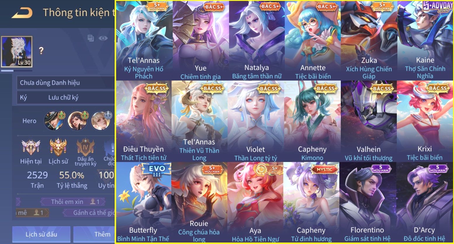 Nổi bật: Skin: Điêu Thuyền Thất Tịch Tiên Tử×Tel'Annas Thiên Vũ Thần Long×Violet Thần Long Tỷ Tỷ×Capheny Kimono×Florentino Giám Sát Tinh Hệ×Capheny Tử Đinh Hương×Full Ngọc, Nhiều Skin SS Đẹp