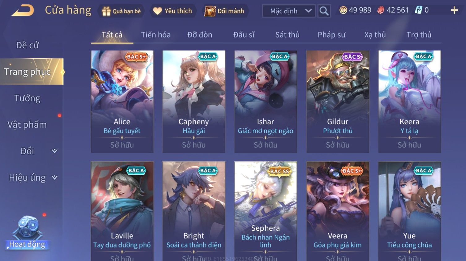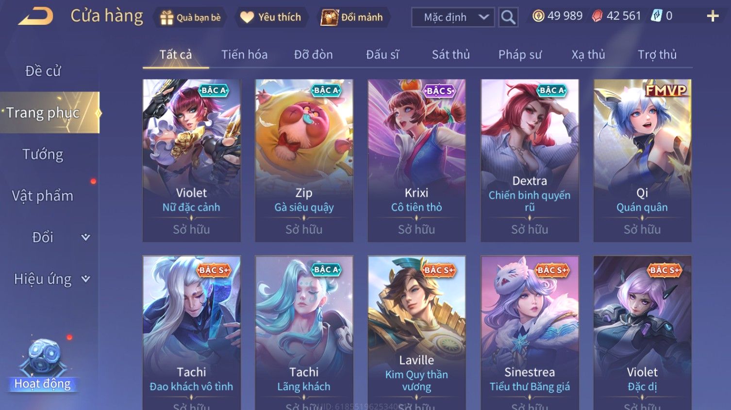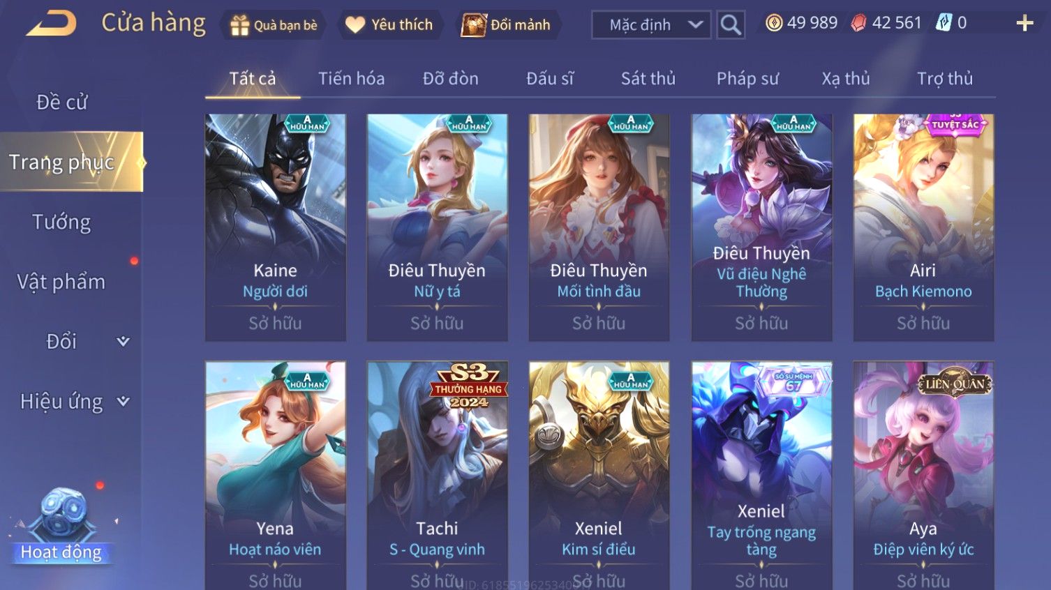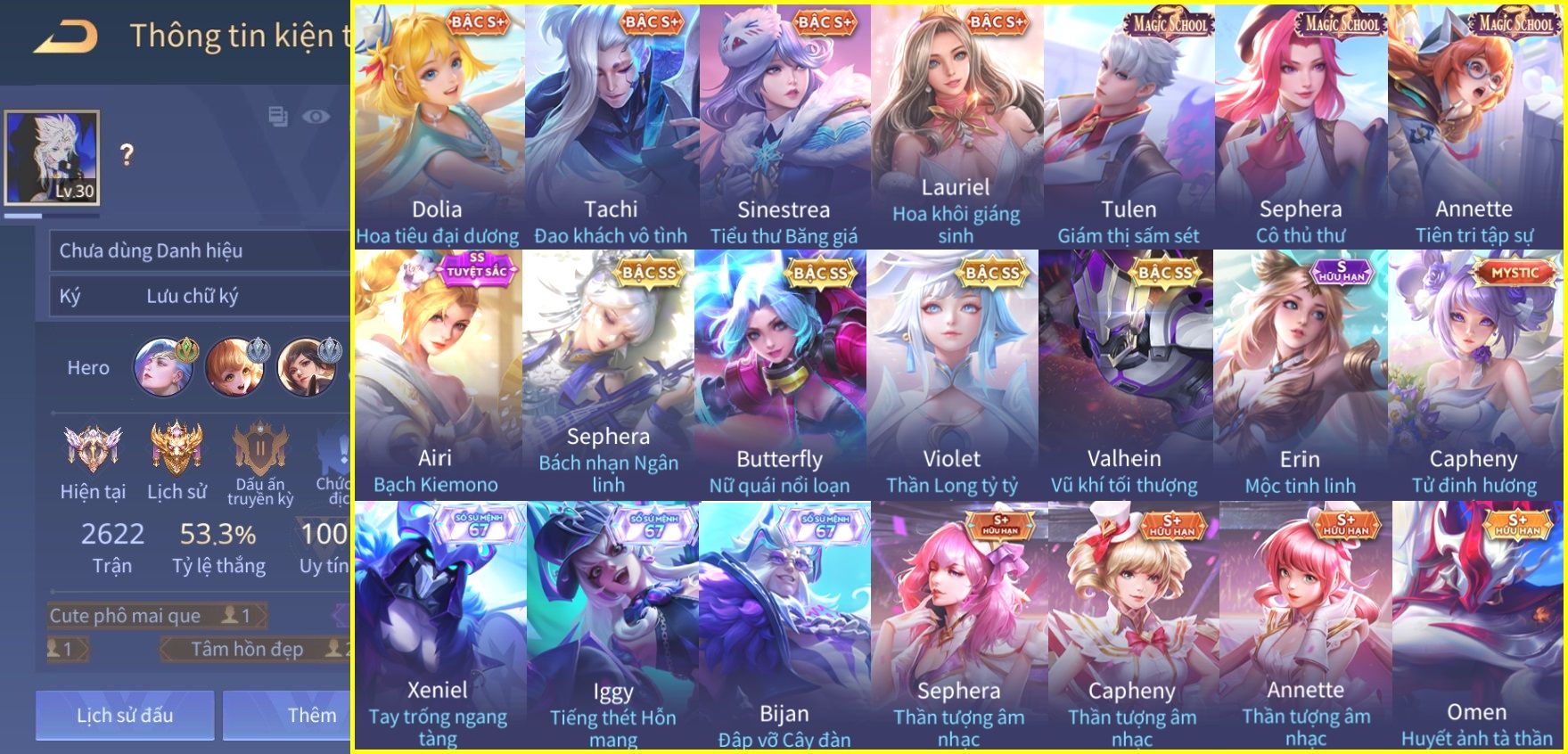 Nổi bật: Skin: Airi Bạch Kiemono×Violet Thần Long Tỷ Tỷ×Capheny Tử Đinh Hương×Butterfly Nữ Quái Nổi Loạn×Tachi Đao Khách Vô Tình×Sephera Bách Nhạn Ngân LinhFull Ngọc, Nhiều Skin SS Đẹp
