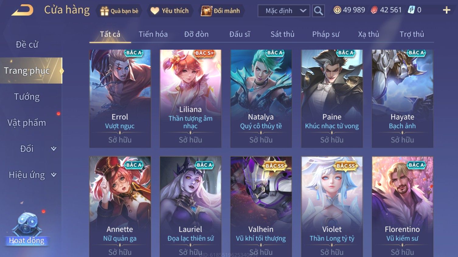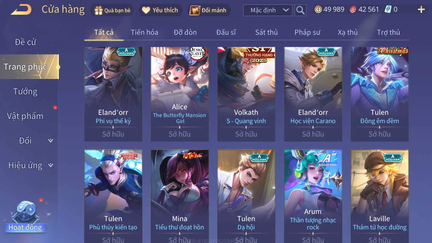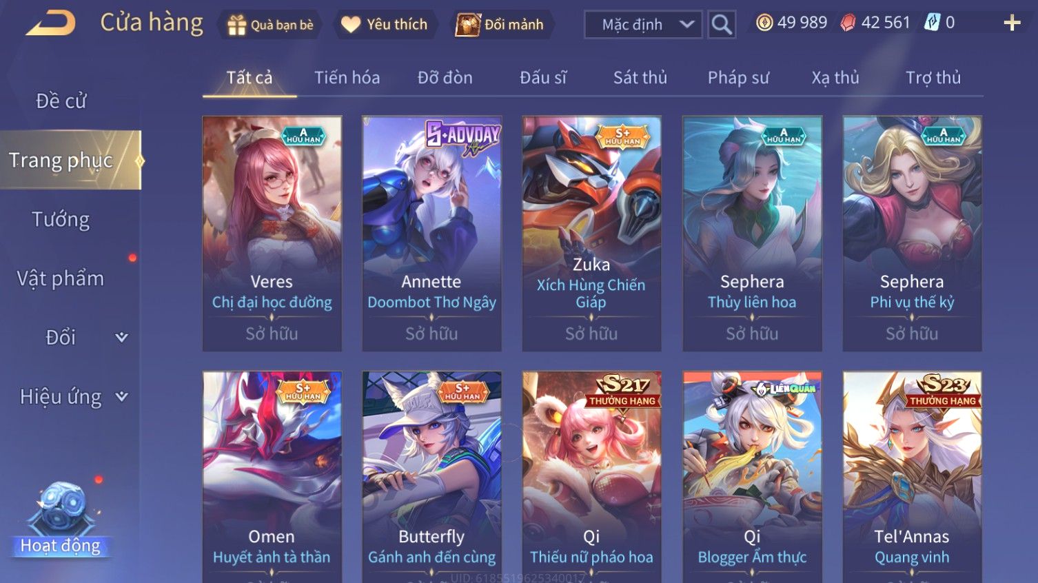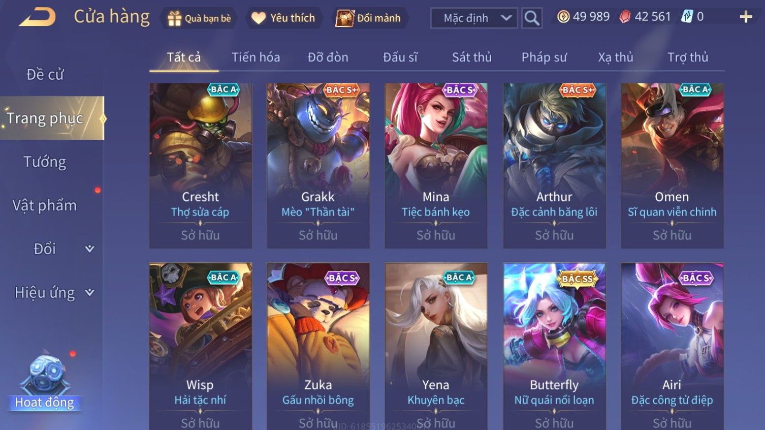 Nổi bật: Skin: Airi Bạch Kiemono×Violet Thần Long Tỷ Tỷ×Capheny Tử Đinh Hương×Butterfly Nữ Quái Nổi Loạn×Tachi Đao Khách Vô Tình×Sephera Bách Nhạn Ngân LinhFull Ngọc, Nhiều Skin SS Đẹp