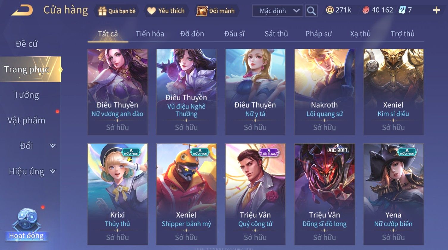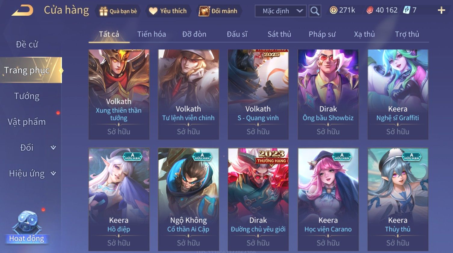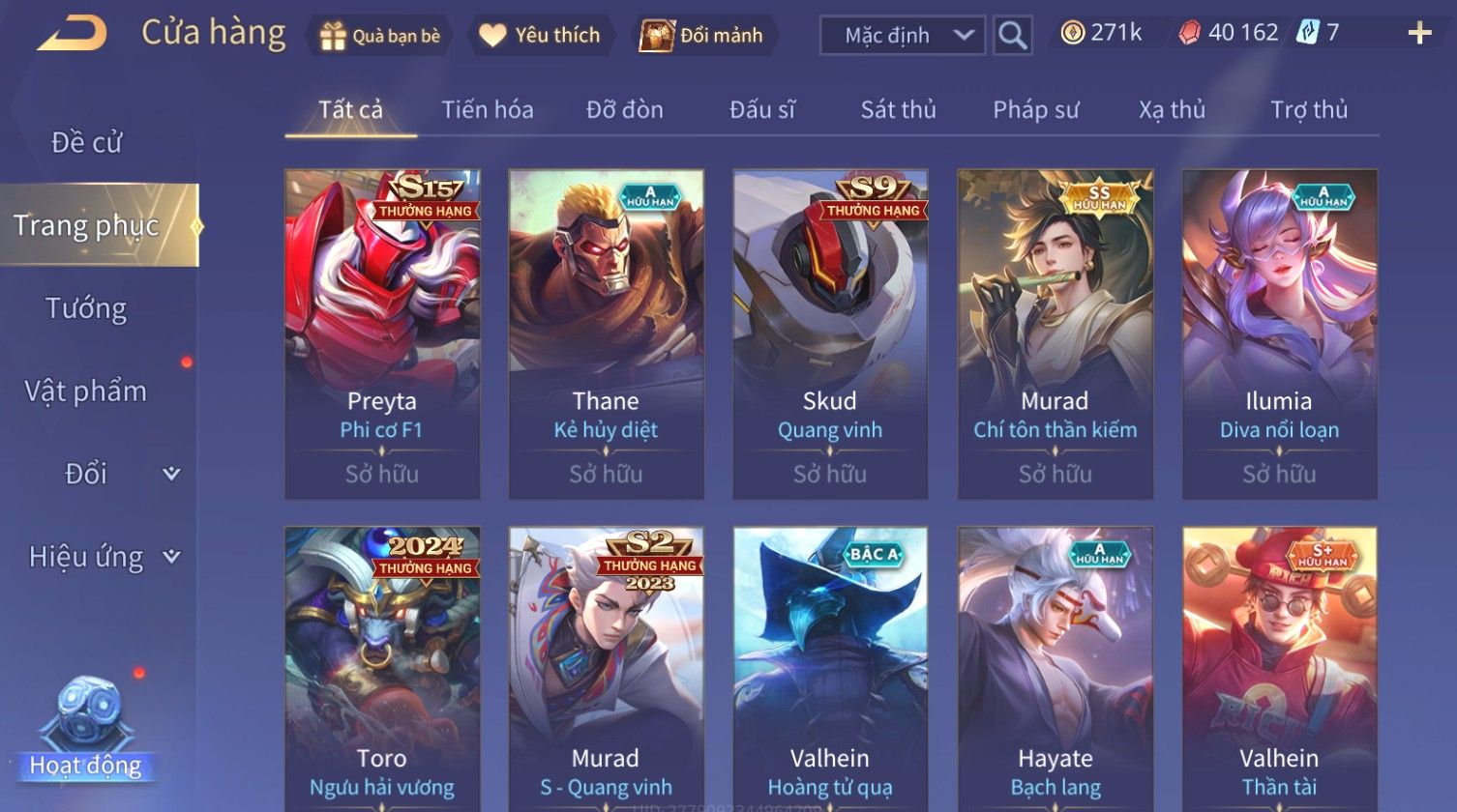 Nổi bật: Skin: Nakroth Lôi Quang Sứ×Murad Chí Tôn Thần Kiếm×Liliana Tiểu Thơ Anh Đào×Ngộ Không Thần Giáp Xích Diễm×Raz Chiến Thần Muay Thái×Violet Thần Long Tỷ Tỷ×Maloch Đại Tướng Rô Bốt×Ryoma Thanh Long Bang Chủ×Cresht Đại Sư Sushi×Full Ngọc, Nhiều Skin SS Đẹp